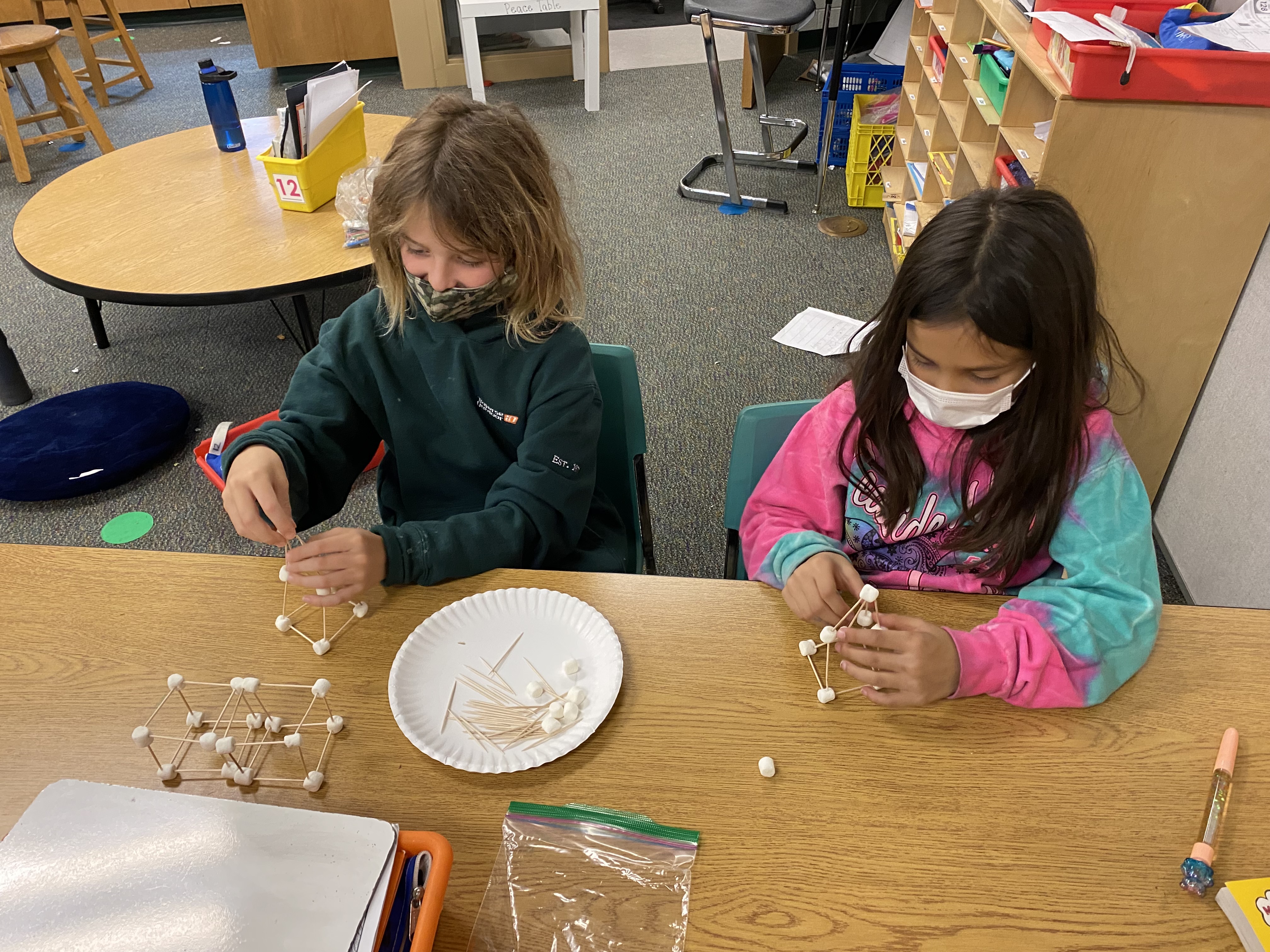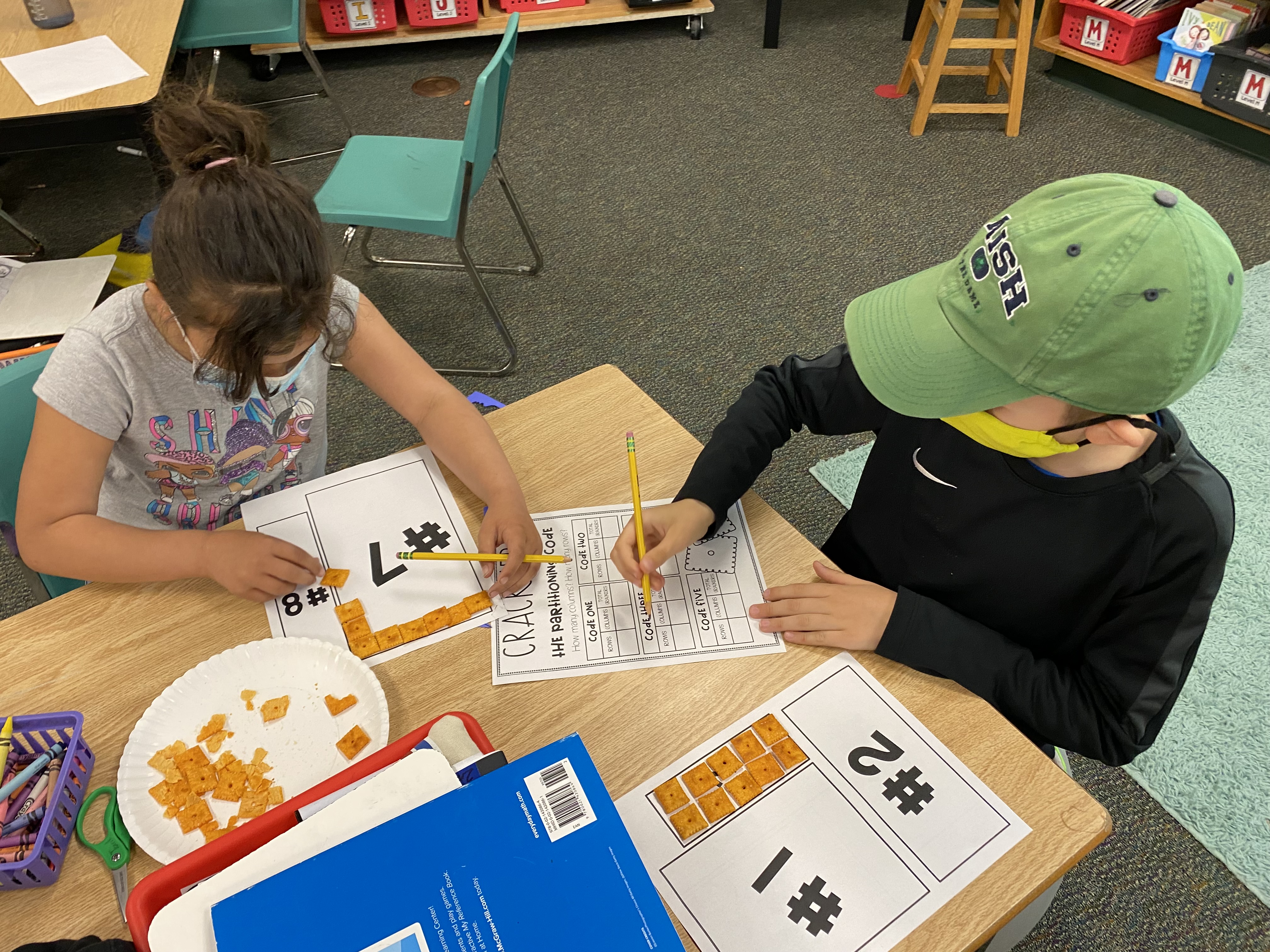 We had a lot of fun in math workshop with a lot of hands on learning! Mathematicians learned about 3D shapes and their attributes. They learned some important vocabulary when describing 3D shapes: faces, vertices, and edges. We created shapes out of marshmallows, wrote riddles ot describe them, played headbands, and even create 3D nets. We wrapped up the week learning how to partition shapes. This is a great introduction to arrays and multiplication. We used Cheez-Its to partition large rectangles equally! What a fun hands on week with shapes!