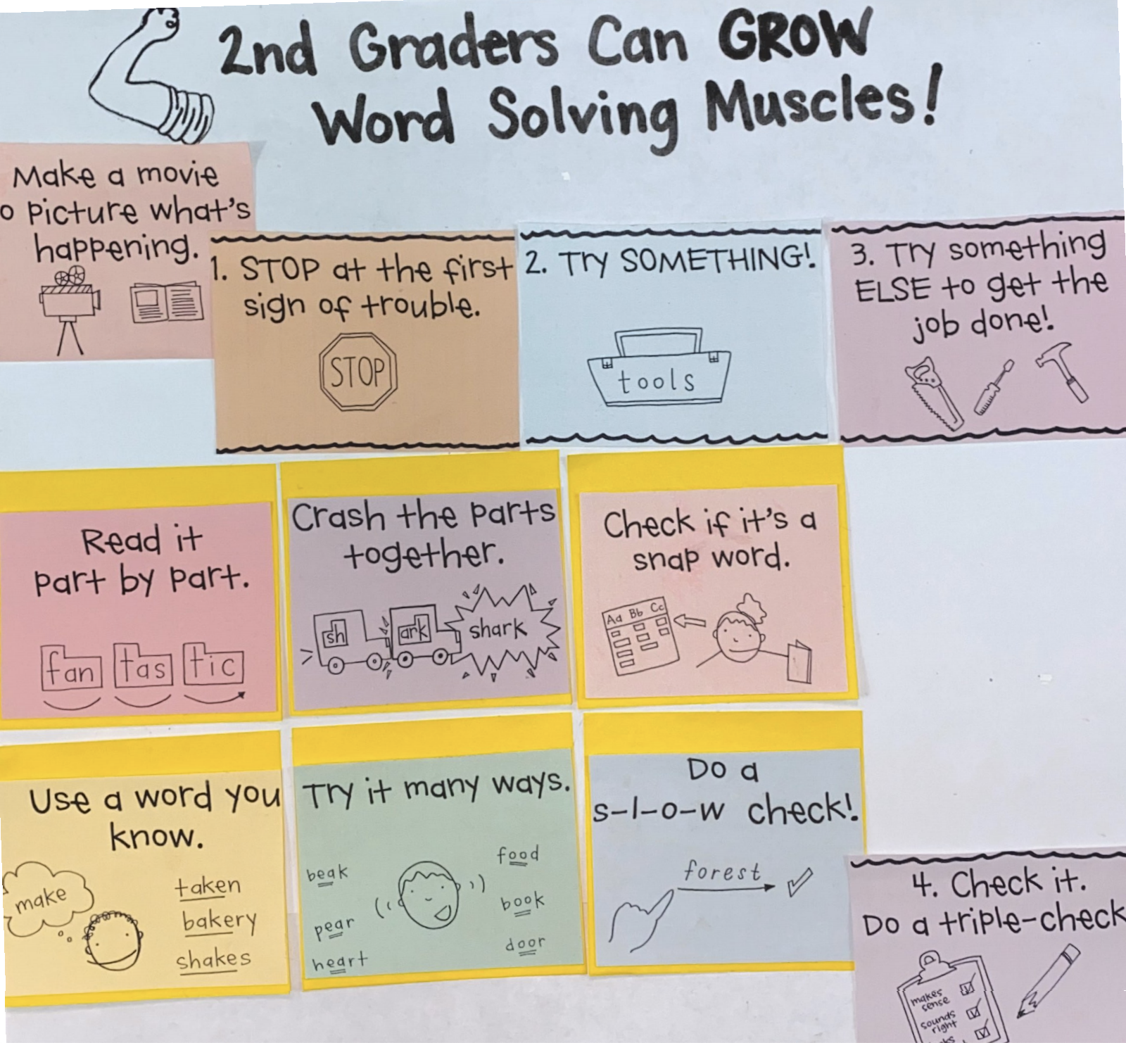 This week we continued to help our 2nd grade reading muscles to grow. We looked at some multisyllabic words and realized that they look scary at first but once we break the word up part by part, the word becomes so much easier. For example, outstanding can be broken up into a few familiar parts- out-st-and-ing. We broke several words up part by part and I could see the light bulbs go off. Readers confidence was growing by the minute and sometimes, that’s all it takes for readers to take off! Please encourage your reader to see a word and try all they know to decode it. I have included a picture of our chart to help you better assist your reader at home!